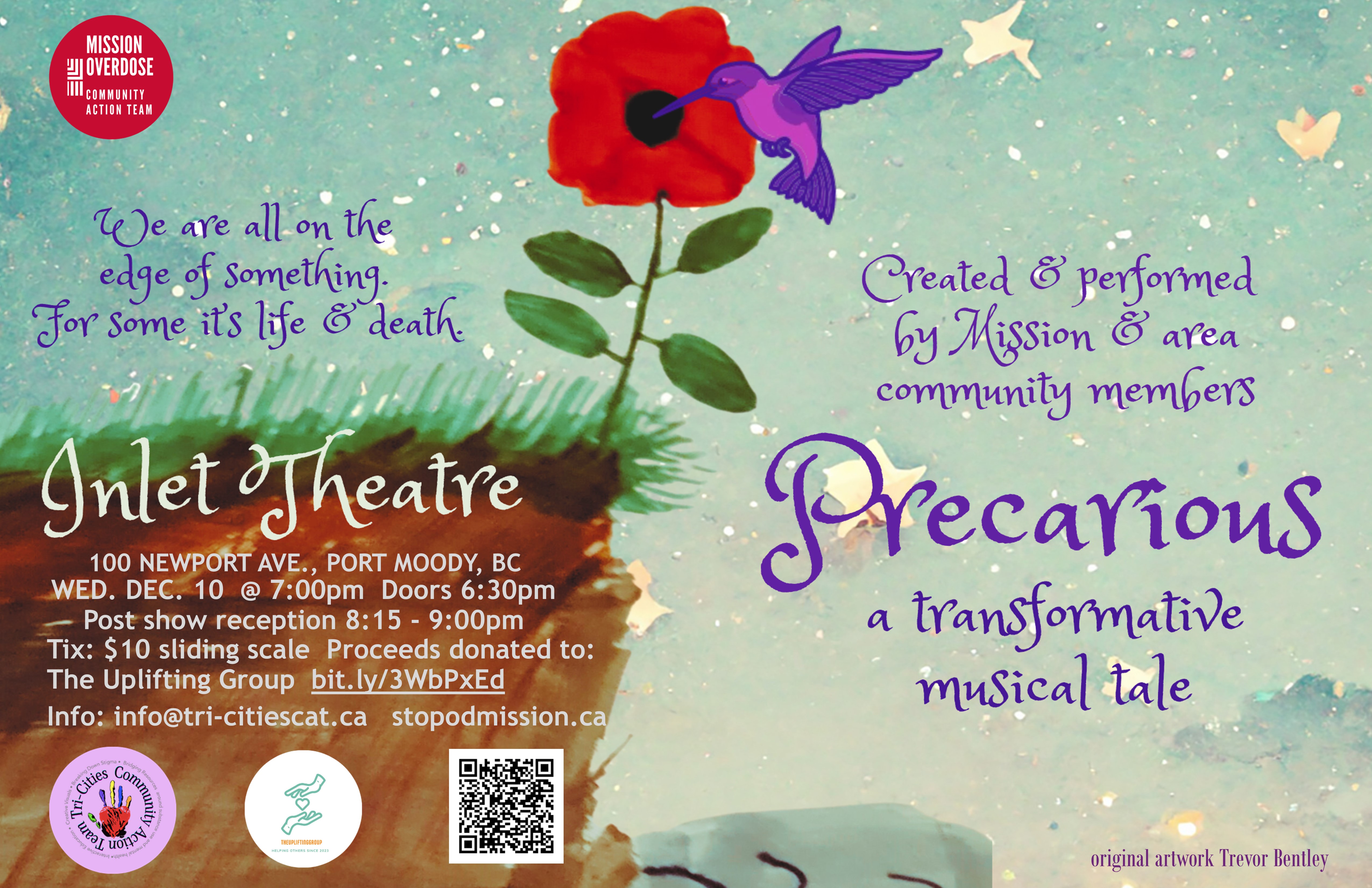 Precarious is a community collage play created by peers, families, and community members with lived and living experience. Through stories, songs, and scenes, it explores the human realities of the toxic drug crisis with honesty, warmth, and hope. Presented by the Mission and Tri-Cities Community Action Teams, the play includes on-site resources and free naloxone training — reminding us that it truly takes a community